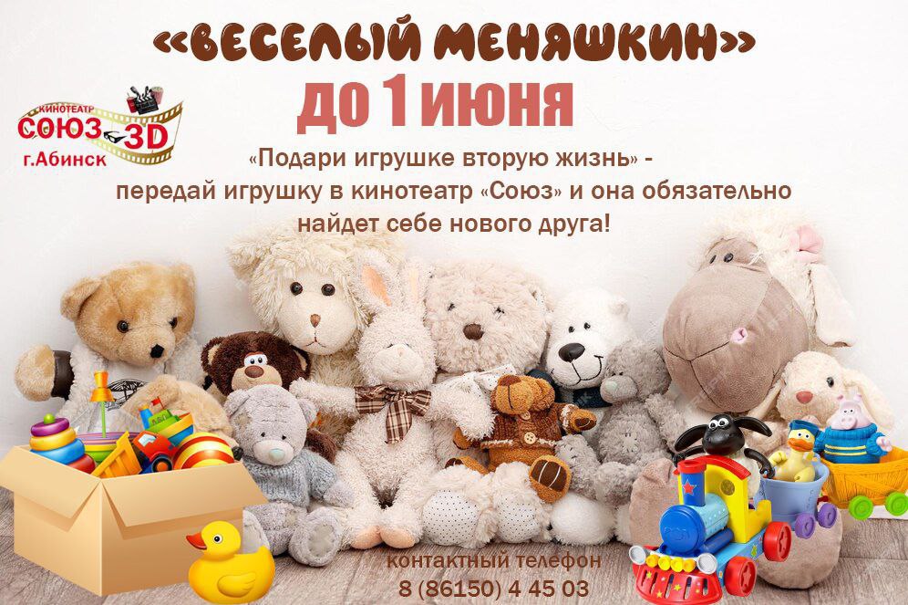 Под лозунгом "Подари игрушке вторую жизнь"! Организаторы призывают всех желающих до 1 июня приносить свои старые игрушки на кассу кинотеатра, чтобы они могли стать другом для новых владельцев.